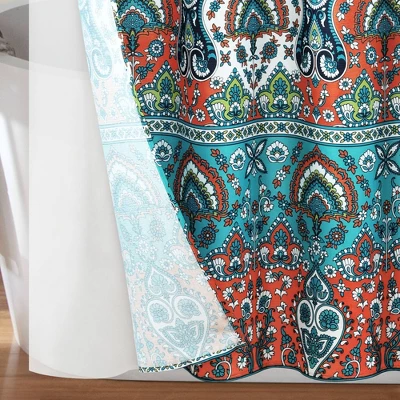 Function meets fashion with this bold boho design in lively colors. Give your bathroom a quick, easy and affordable makeover with Lush Décor’s Bohemian Meadow Shower Curtain 14 Piece Complete Set. The Bohemian Meadow Shower Curtain 14 Piece Complete Set includes everything you need for your shower together in one package: the bohemian style shower curtain, PEVA liner and plastic rings for hanging them. The rings measure 2.2 inches in diameter, and we add in two extra rings for your convenience. If you love a colorful boho style for your bathroom, our Bohemian Meadow Shower Curtain 14 Piece Complete Set is for you. Printed on Microfiber, this set truly stands out and would look excellent in a teen’s bathroom, guest bathroom or a master bathroom. Either color option will truly brighten your space and your day. The shower curtain measures 72 inches on all sides and should easily fit nearly any bathtub. It may not be large enough for a claw foot tub. For your convenience, this shower curtain is safe to machine wash and tumble dry. Please follow all instructions on the product’s care label. Part of the Bohemian Meadow Collection.