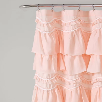 Pretty, elegant shower curtain with ruffle layers and small pom pom details covering the entire panel.