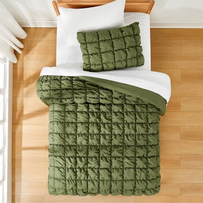 The luxurious comfort of this Puff Quilted Comforter Set will have you wanting to stay in bed all day! Great for any bedroom or dorm room, this cozy set features a super soft, cloud-like texture with a box quilting pattern. This 3 piece bedding set includes 1 comforter and 2 shams, while the 2 piece set includes 1 comforter and 1 sham. Crafted from a soft crinkle microfiber and lightweight polyfill this set is STANDARD 100 by OEKO-TEX® certified, all components have been tested and certified free from harmful substances. Dry clean only.