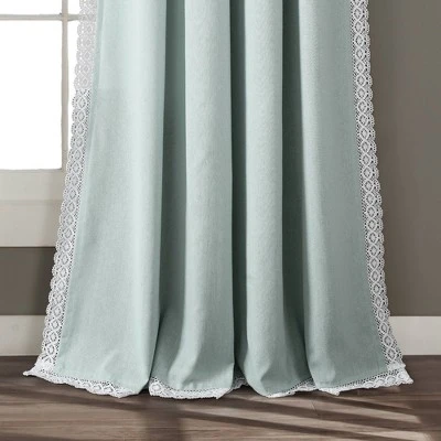 The Rosalie Window Panel Set is simply elegant with a solid linen fabric. The panels also feature a beautiful and delicate lace border along all of the edges, except the top. These curtains add a dreamy touch to your bedroom, living room or dining room. The Rosalie Window Panel Set can be used to create an elegant look, enhance a shabby chic theme, or even to add a nice touch to a farmhouse look. The slight weaving variations are true to this natural fiber blend fabric. These curtains are not lined. This Rosalie Window Panel Set will filter out some of the sunlight and provide privacy inside your home, but they will also let in a good amount of natural light. The Rosalie Window Panel Set is sold by the pair, and each panel measures 54 inches in width. You have multiple options for the length of the panels, including 63 inches, 84 inches, 95 inches, 108 inches and 120 inches (some lengths may not be available in all colors). Installation is very easy with a 3″ rod pocket that slides right onto your curtain rod. You may also hang this Rosalie Window Panel Set with clip rings, as shown in the pictures. Because of the delicate lace border, we recommend that you have these dry cleaned when it is time to wash them. However, you may also hand wash and hang to dry. Part of Rosalie collection.