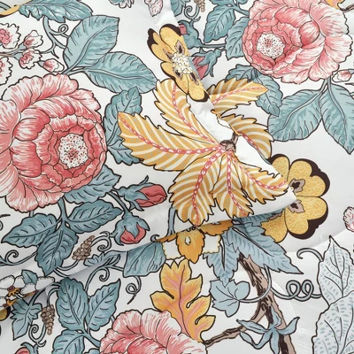 This colorful floral print comforter set is the perfect piece to update your master or guest bedroom with vintage beauty and country cottage style. This Sydney Comforter 7 Piece Set will definitely brighten your space with understated elegance. The print in bright colors is very inviting, which makes it ideal for a guest bedroom as well as the master bedroom. It will truly make a statement in any bedroom in your home. This Sydney Comforter 7 Piece Set includes a soft and cozy comforter, two unique decorative throw pillows, two pillow cases and two Euro shams, providing a complete look as well as comfort, convenience, and luxury. The square decorative pillow features a pretty bird resting on a branch against a solid off-white background. The rectangular pillow is a solid color with pleated detail. These pillows complete the look of the Sydney Comforter 7 Piece Set. For your convenience, the comforter and all shams are safe to machine wash and tumble dry. Decorative pillows should be spot cleaned only. Please follow all care instructions on the product labels. Part of the Sydney Collection.