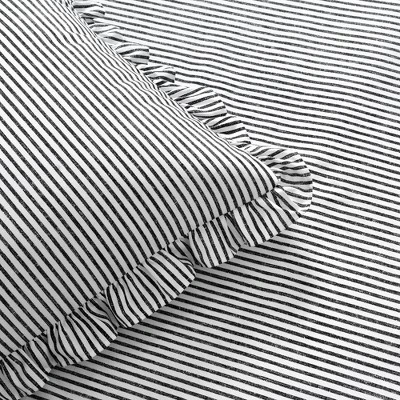 This Ticking Stripe Bedspread Set is very trendy. The classic pinstripes printed on the front never go out of style, and the ruffled edges are very chic and stylish. The Ticking Stripe Bedspread Set, which is available in soft neutral colors to create a calming atmosphere, features a stunning, fashionable look to brighten any bedroom or dorm room. Because it is lightweight, it is ideal for layering and for use during the spring and summer. In warmer climates, it can be used year-round. This Ticking Stripe Bedspread Set is sure to impress all your guests with the incredible amount of special details that are incorporated in the design. Its generous size will create the beautiful overhang look for a more glamorous feel. From a child’s bedroom to your own master bedroom, this Ticking Stripe Bedspread Set is ideal for use for all ages. Give your daughter a lovely first big girl bedroom or update your teenager’s bedroom into a princess palace. This set would even look fabulous in dorm rooms, guest bedrooms and master bedrooms. The Ticking Stripe Bedspread Set is available in four sizes. The Twin size is a 2-piece set which includes a soft and luxurious bedspread and one matching pillow sham. The Full, Queen and King sizes are 3-piece sets which include the bedspread and two matching pillow shams. Due to the delicate nature of the ruffles, we highly recommend that you dry clean this bedspread as well as the shams. Oeko-Tex Certified.